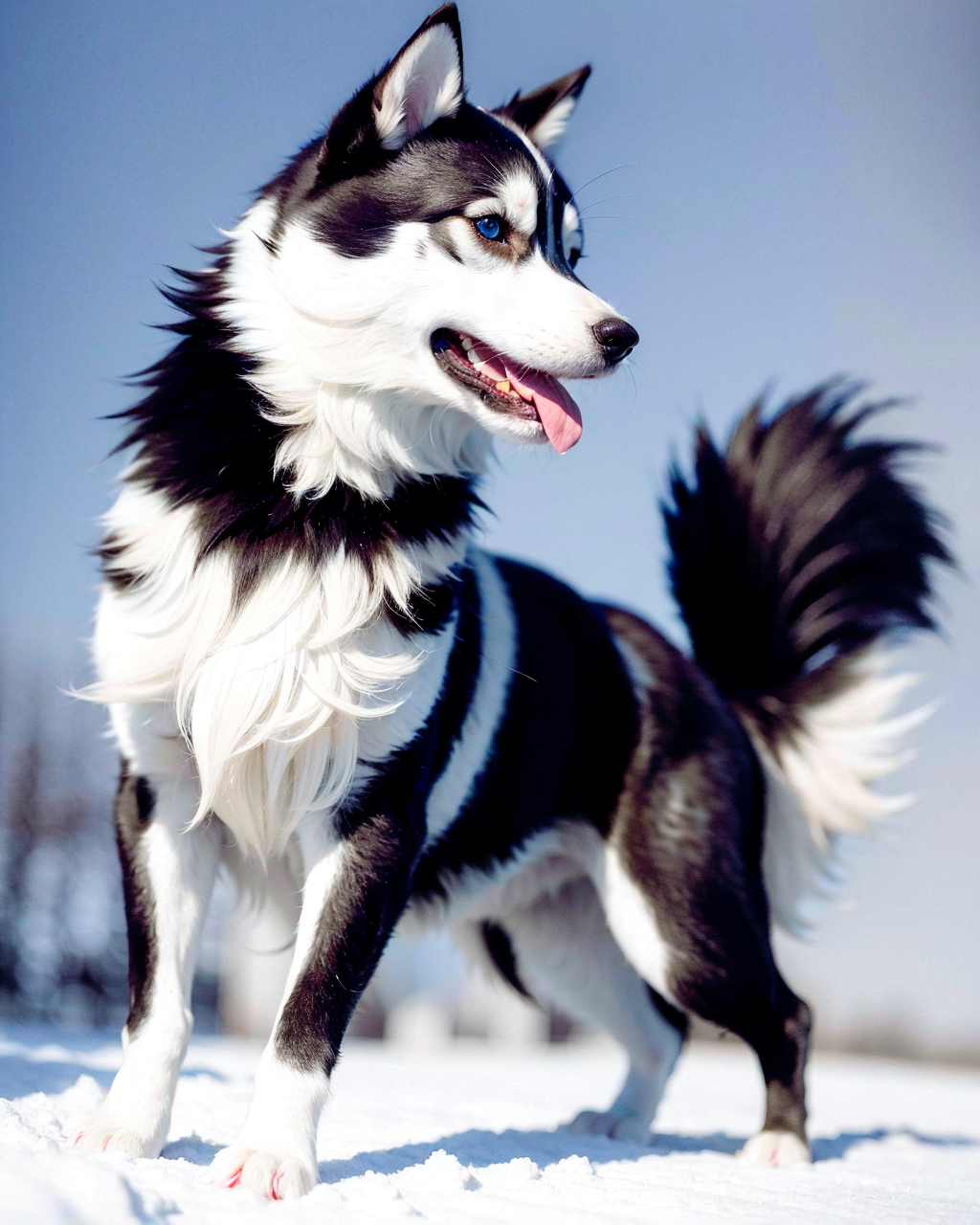 masterpiece, (amazing awesome exquisitely extremely finely hyper intricate super ultimate ultra wonderful detailed), a black and white dog standing in the snow with its mouth open and tongue out, with its tongue out, An Gyeon, majestic, a photocopy, color field, shallow depth of field