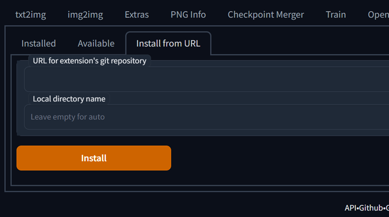 SD를 실행시키면 메뉴 중에 'Extensions' 메뉴가 왼쪽 끝에 있습니다. 거기서 Install from URL 탭을 선택하고 URL에 아래 두가지를 붙여넣기 해서 Install을 해줍니다.