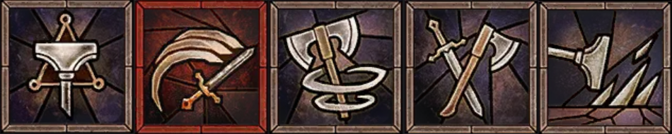 야만용사는 크게 총 7개의 스킬 클러스터와 고유 메카닉 시스템을 가지고 있는데 기본, 주력(코어), 직업 고유 클러스터(3개, 야만용사는 방어, 난투, 무기 마스터리)와 궁극기 클러스터, 핵심 지속 스킬 클러스터 입니다.