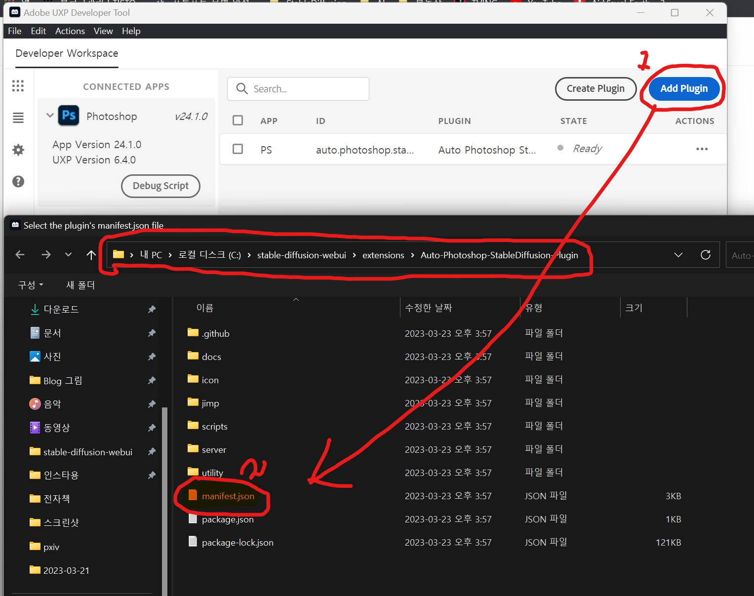 4) Adobe UXP 앱에서 오른쪽 상단에 있는 Add Plugin을 실행해서 플러그인을 실행합니다. 위에 1) 과정에서 extensions로 설치한 폴더로 들어가면 manifest.json 파일을 열면 됩니다.