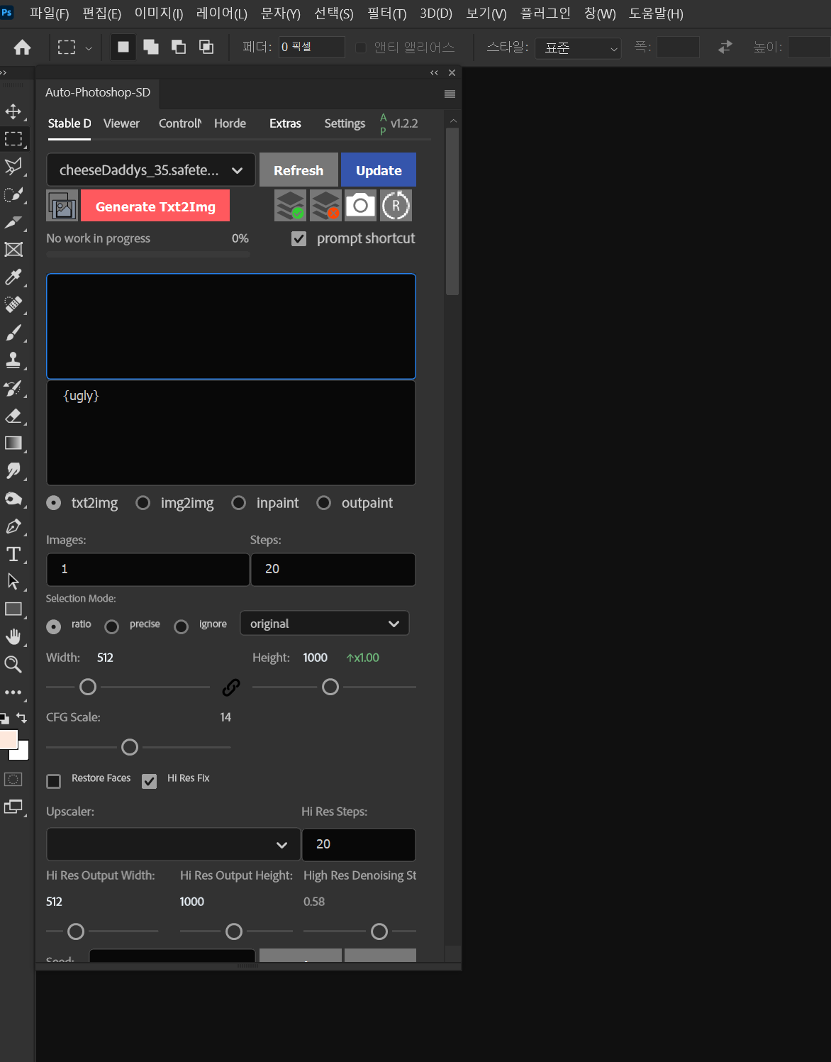 오늘은 포토샵 안에서 Statble Diffusion을 플러그인으로 사용하는 방법을 알아보려고 합니다. 포토샵을 원래부터 잘 다루고 있는 분들은 SD보다는 포토샵 환경이 더 편하실 텐데요. 이 플러그인을 설치하면 포토샵 안에서 SD를 사용할 수 있으니 작업하는데 더 편하실 것 같습니다. 저 같은 경우는 잘 뽑힌 이미지들은 포토샵으로 한번 더 가져가서 손가락 등을 리터칭 하기 위해 포토샵을 이용하는 일이 잦은데 이 플러그인을 이용해서 생성과 수정을 같이 할 수 있어서 좀 더 편하게 수정할 수가 있었습니다.