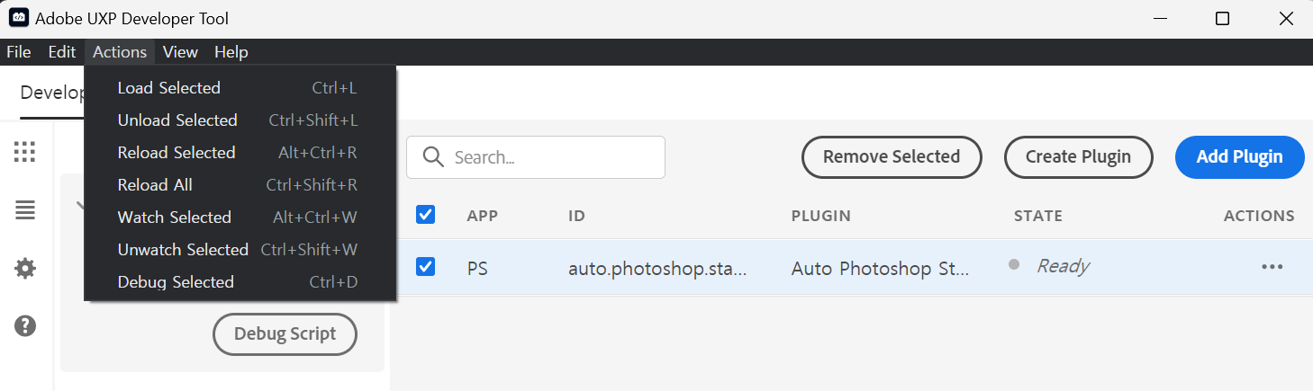 8) 이제 포토샵을 재 실행시켜 주시고, UXP 개발툴에 들어가서 설치된 플러그인을 메뉴 Actions 메뉴에서 Load Selected를 실행해 줍니다.