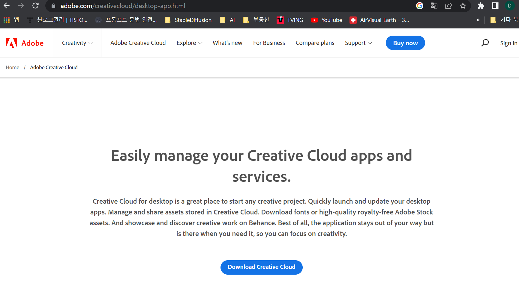 2) 포토샵에 플러그인 설치를 위한 creativecloud를 설치합니다. (adobe.com/creativecloud/desktop-app.html)