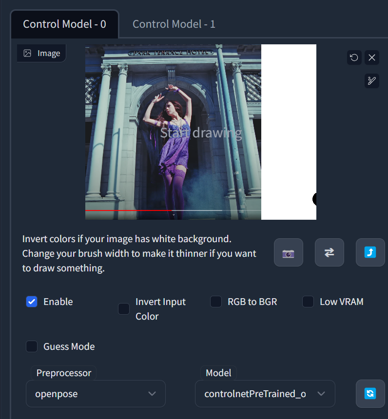 추출하고 싶은 포즈를 하고 있는 이미지를 controlnet에 등록합니다. 저는 유튜브에서 가져왔는데요. 원하는 포즈를 찾지 못한 경우 본인의 사진을 직접 찍어서 올려도 됩니다. 사진을 등록한 후 Enable 체크 후 Preprocessor와 Model을 둘 다 openpose와 controlnetPreTrained_openpose로 선택하여 줍니다.
