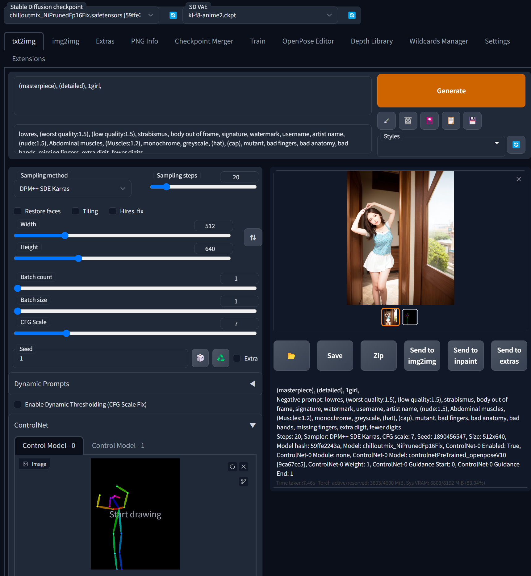 생성된 pose 뼈대는 따로 저장해놨다가 필요할 때 뼈대만 가져와서 사용할 수 있습니다. 저장한 pose를 컨트롤넷으로 가져옵니다. 이번에는 포즈가 생성되어 있으므로 전처리 과정을 생략합니다. preprocessor에서 'none'으로 변경하고 model에서는 controlnetPreTrained_openpose를 선택해 줍니다. 3번에서 진행할 때는 이미지를 기본으로 포즈를 추출해야 되므로 전처리기 선택이 필요한 거고 이미 포즈 뼈대가 있으면 전처리 과정을 생략합니다. 이제 원하는 그림이 나올 때까지 Generate 해주면 됩니다!