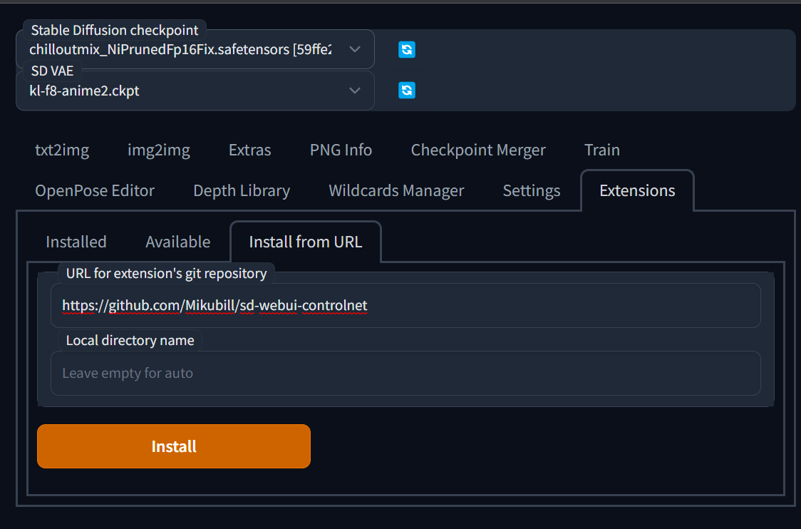sd webui를 실행한 후 extesions > install from URL에 들어가서 "https://github.com/Mikubill/sd-webui-controlnet" 붙여 넣어주고 Install을 합니다. 그리고 SD를 재실행하시고 UI를 리로딩해 주시면 설치가 되신 화면을 볼 수 있습니다.