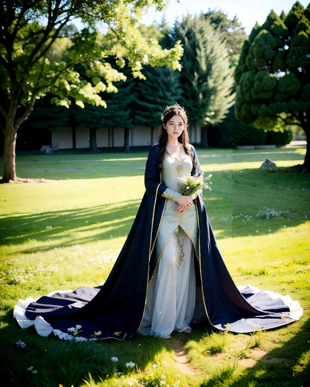 In a field of flowers, a woman stands, Her gown of deep blue flowing in the breeze. Her hair is pulled back in a bun, And a tiara rests on her head.
