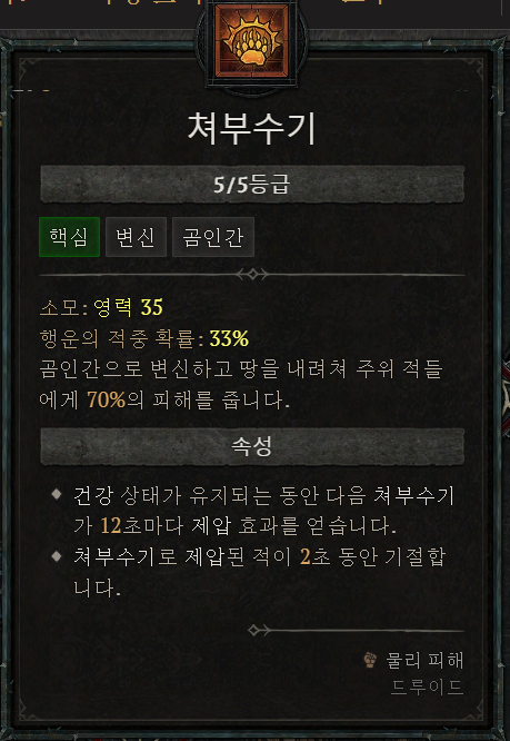쳐부수기를 핵심스킬로 사용하는 곰 드루는 스킬을 통해 제압 피해를 기본 효과로 줄 수 있기때문에 강력한 한방 능력을 줄 수 있습니다. 영력 수급과 생존기 스킬을 잘 분배하고 그에 맞는 템을 장착해 준다면 타 직업처럼? 시원시원한 스킬과 강력한 생존력의 곰 드루이드의 모습을 보여줄 수 있을 것입니다.