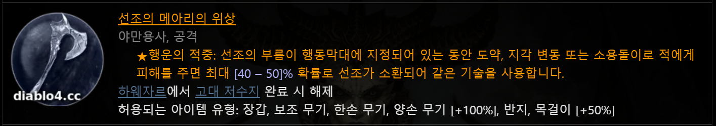 선조의 부름이 행동막대에 지정되어 있는 동안 도약, 지각 변동 또는 소용돌이로 적에게 피해를 주면 최대 40-50% 확률로 선조가 소화된어 같은 기술을 사용합니다. 5초에 한번만 발생할 수 있습니다.