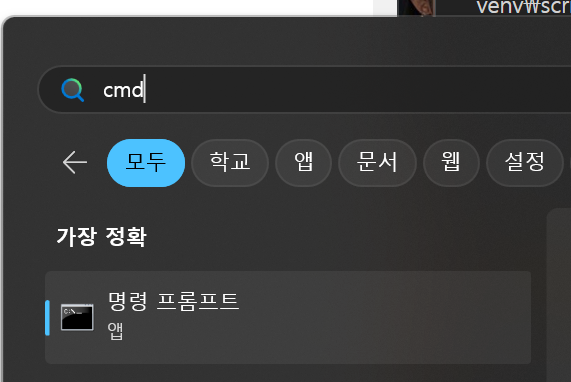 윈도우 명령 프롬프트를 실행합니다. 시작 메뉴에서 cmd를 입력해 주시면 됩니다.