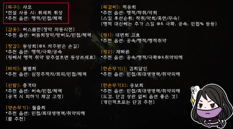 이 빌드는 던전 클리어와 보스 처치에 모두 최적화되어 있으며, 높은 티어 콘텐츠에서도 높은 데미지 출력과 강력한 방어 능력을 제공합니다.