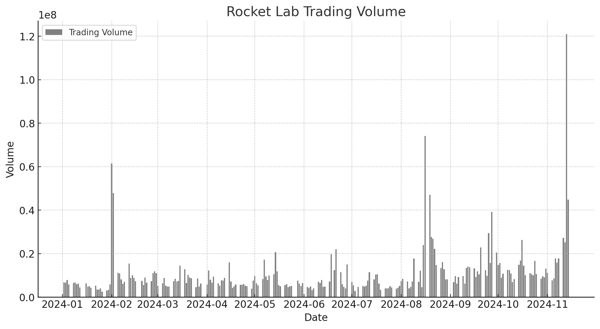 2024년 11월 14일 기준, 로켓랩의 주가는 17.36달러로 마감하였으며, 최근 단기적인 급등세를 보이고 있습니다.