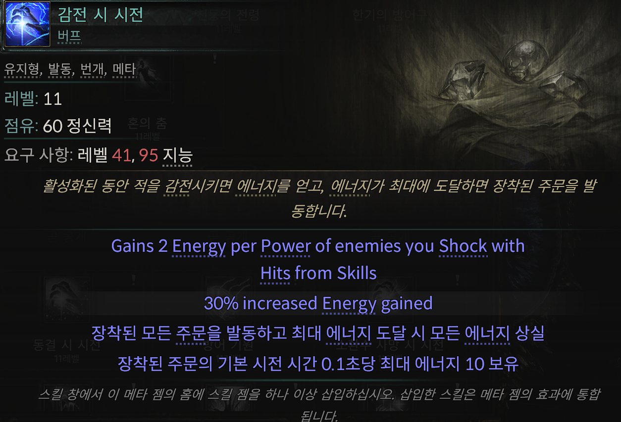 - 이 스킬은 메타 젬으로 작동하며, 적을 충격(Shock) 상태로 만들 때마다 에너지를 얻고, 설정된 스킬 젬이 자동으로 발동됩니다.