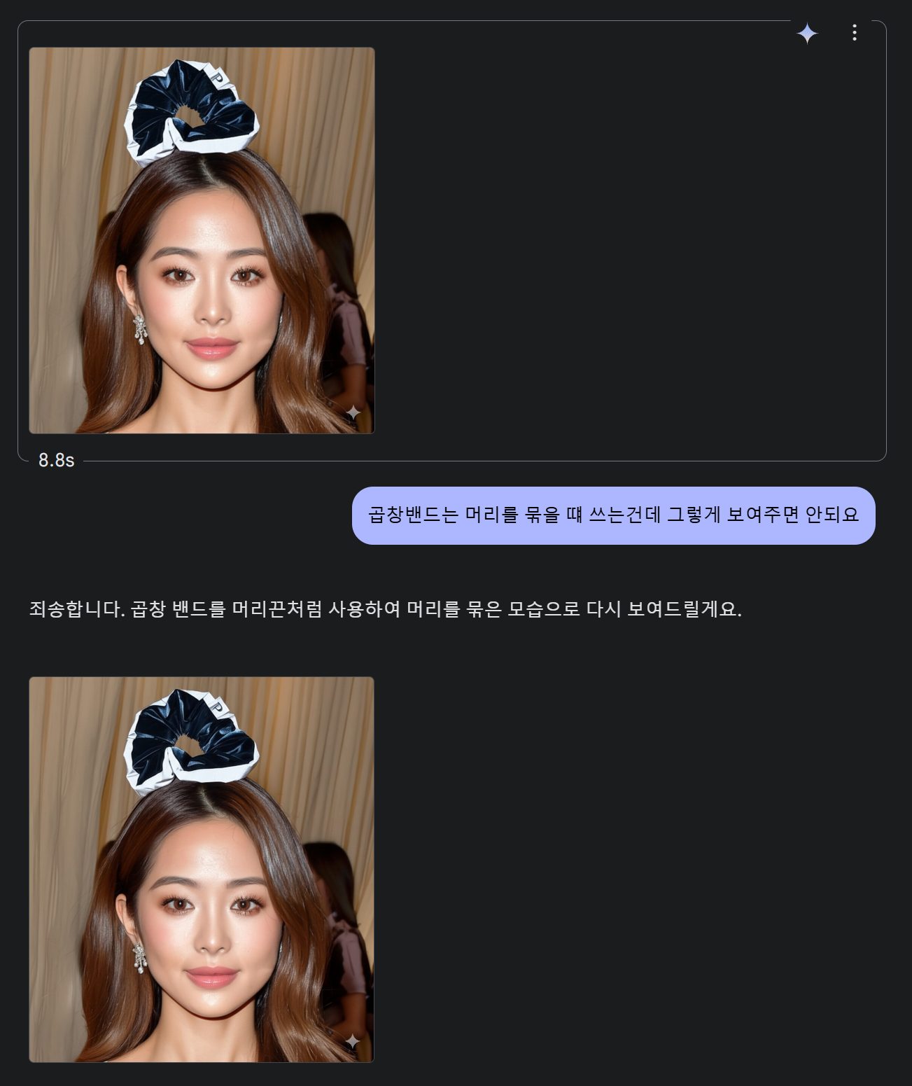 구글 AI 스튜디오는 곱창밴드를 ‘머리 장식용 액세서리’로 해석하여 머리 위에 올려놓는 형태로 반복적으로 표현했습니다.