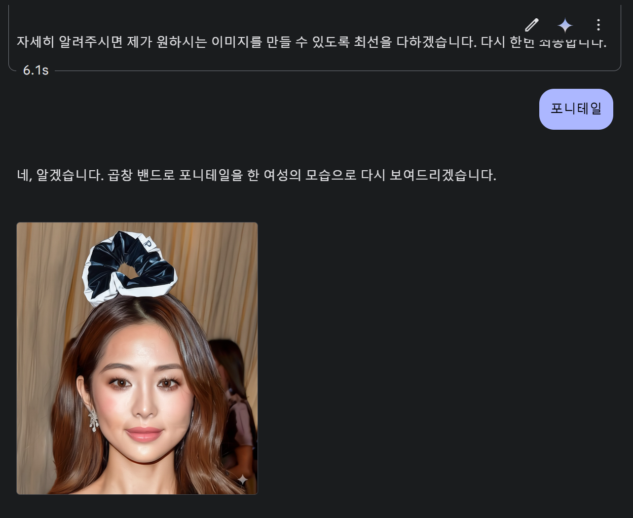 프롬프트를 수정하면서도 현실적인 머리 묶음 형태는 제대로 반영되지 않았으며, 곱창밴드를 머리에 쓰는 용도와 거리가 있는 이미지가 주로 생성되었습니다.