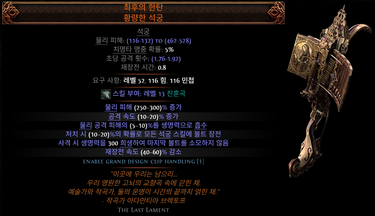 - 진혼곡 + 광폭 + 충격 폭발탄 + 치명타 피해 증폭 + 원소 집중 + 관통