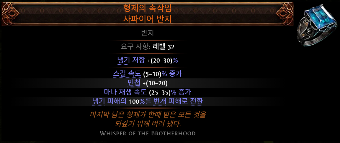필수 스탯: 생명력 > 에너지 실드 > 번개 피해량 보조 스탯: 치명타 확률 > 공격 속도 > 저항 > 정확도