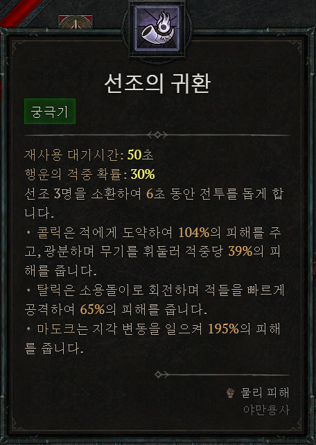 - 궁극기 : 선조의 부름, 맹공, 뇌진탕