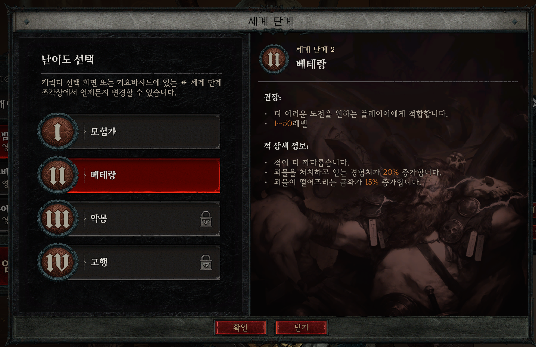 디아블로 4에서 각자 선택직업으로 엔드세팅을 위해 달리실 텐데요. 빨리 좋은 템을 얻고 싶으실 겁니다. 처음에 시작하면 월드티어가 모험가, 베테랑까지만 가능한데요. 나이트메어로 넘어가기 위해서는 모든 캠페인 클리어가 되어야 월드 티어 3 (악몽)로 넘어갈 수 있습니다. 그러기 위해서는 빠른 캠페인 진행이 필요할 텐데 직업에 따라서 몹과 보스 잡는 시간이 더뎌질 수 있습니다. 따라서 월드 티어는 가장 쉬운 1단계 모험가 모드로 진행하시길 추천합니다. 메인스토리와 직업퀘스트만 1단계로 진행하시고 더 많은 보상을 위해 사이드퀘스트는 월드 티어 2 (베테랑)으로 진행하시면 됩니다. - 직업퀘스트는 바로 수행